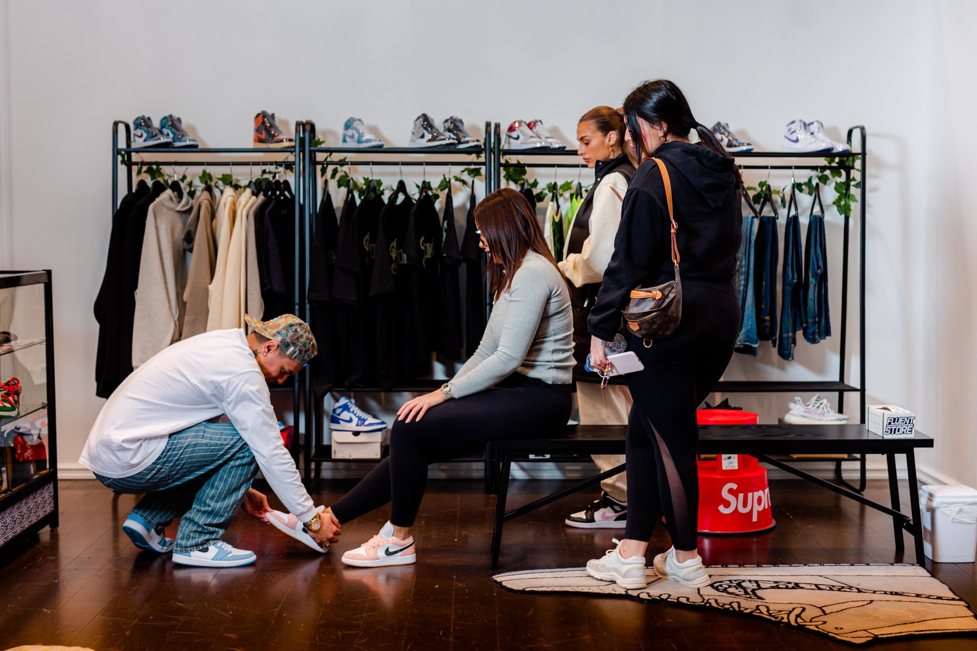 Since Fluent first opened doors in 2020, the streetwear store has become a mecca for sneakerheads. Collectors travel from all over to see the rare sneakers on display, while the feature wall – adorned with the latest Yeezies, Jordans, Nikes, and more – entices passers-by to step inside and grab their first pair of kicks.