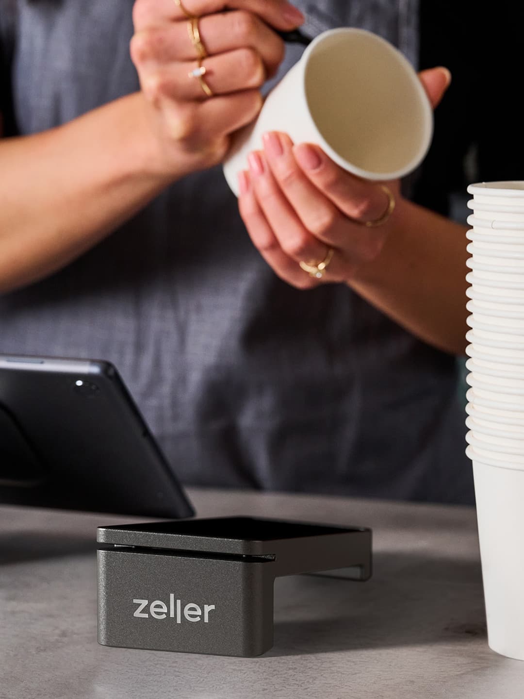 • Zeller Terminal 2 can be plugged into a power source, or used wirelessly to accept up to 1,300 transactions on a single charge.